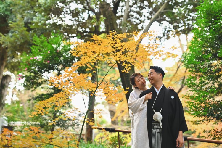 スコティッシュなチェックの柄と、伝統ある紋付が融合した現代風の着こなしが叶う一着。古来から伝わる伝統的な紋付とは一線を画す雰囲気が特徴。こちらの紋付も新婦様とのカラーリンクコーデが叶います。