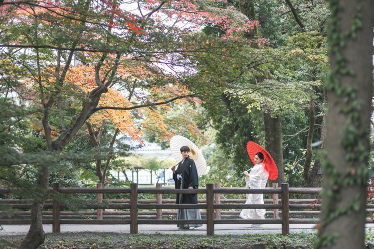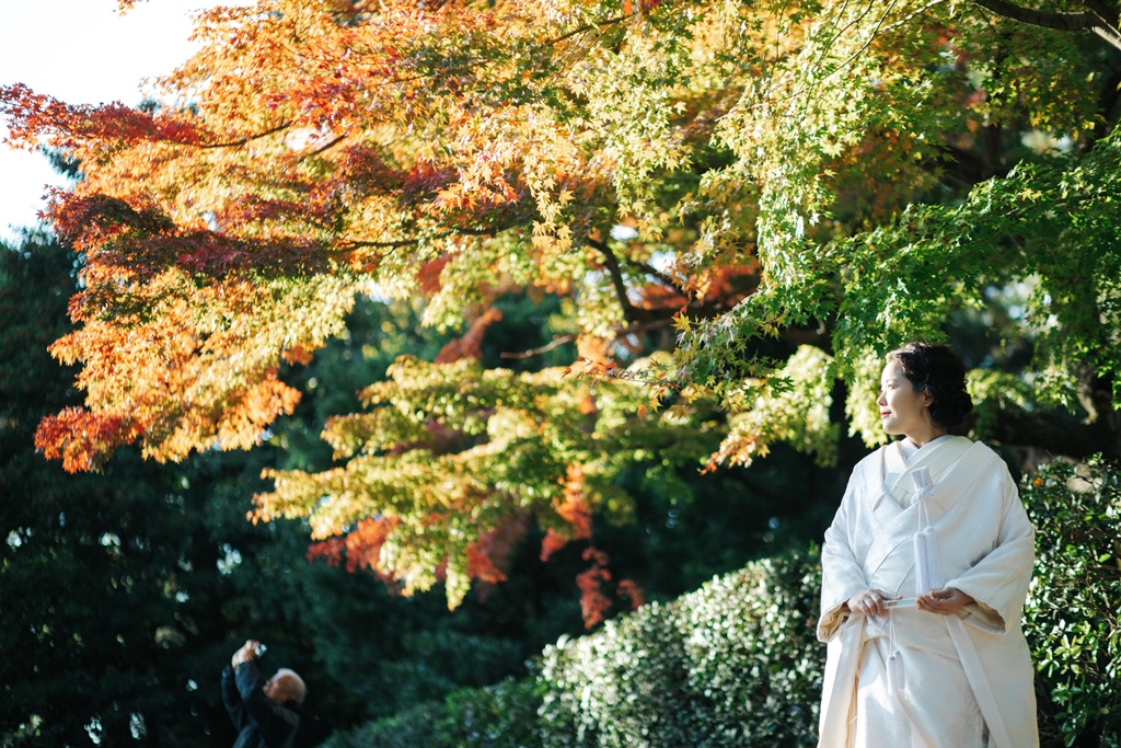 葉の色は赤やオレンジ、グリーン、黄緑など何色にも変わる紅葉を楽しむことができ、鮮やかな色の木々が和装をより引き立ててくれます。
