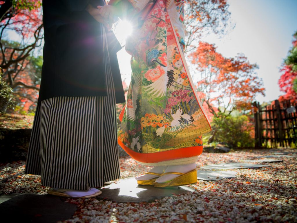 庭園の紅葉を背景にした一生の思い出を作りましょう。