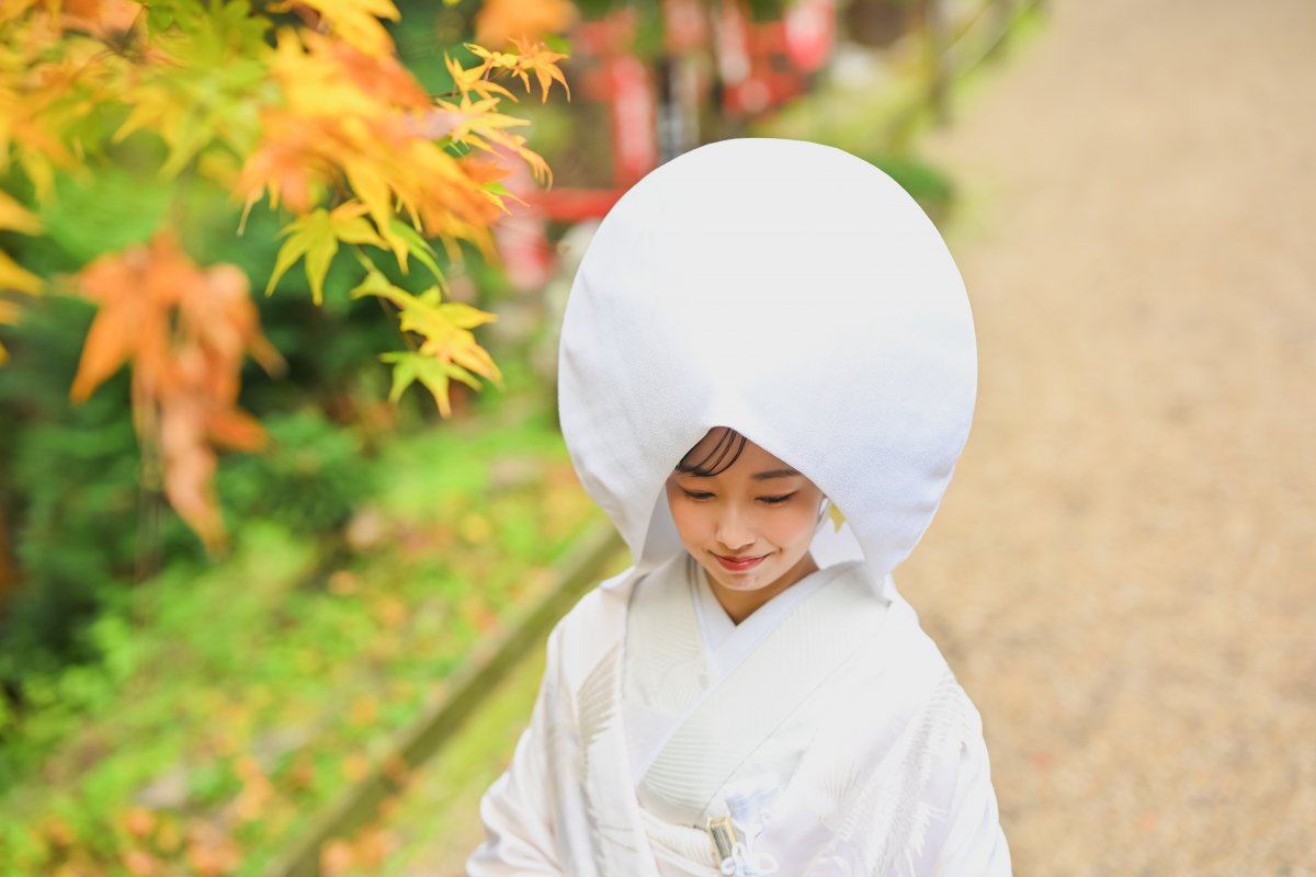 もみじの赤やオレンジに囲まれて、白無垢と綿帽子姿の花嫁さまが立つ光景は、秋ならではの特別な美しさです。白い衣装のやわらかさと紅葉の鮮やかな色合いが重なって、まるで自然の一部のように景色に溶け込んで見えます。