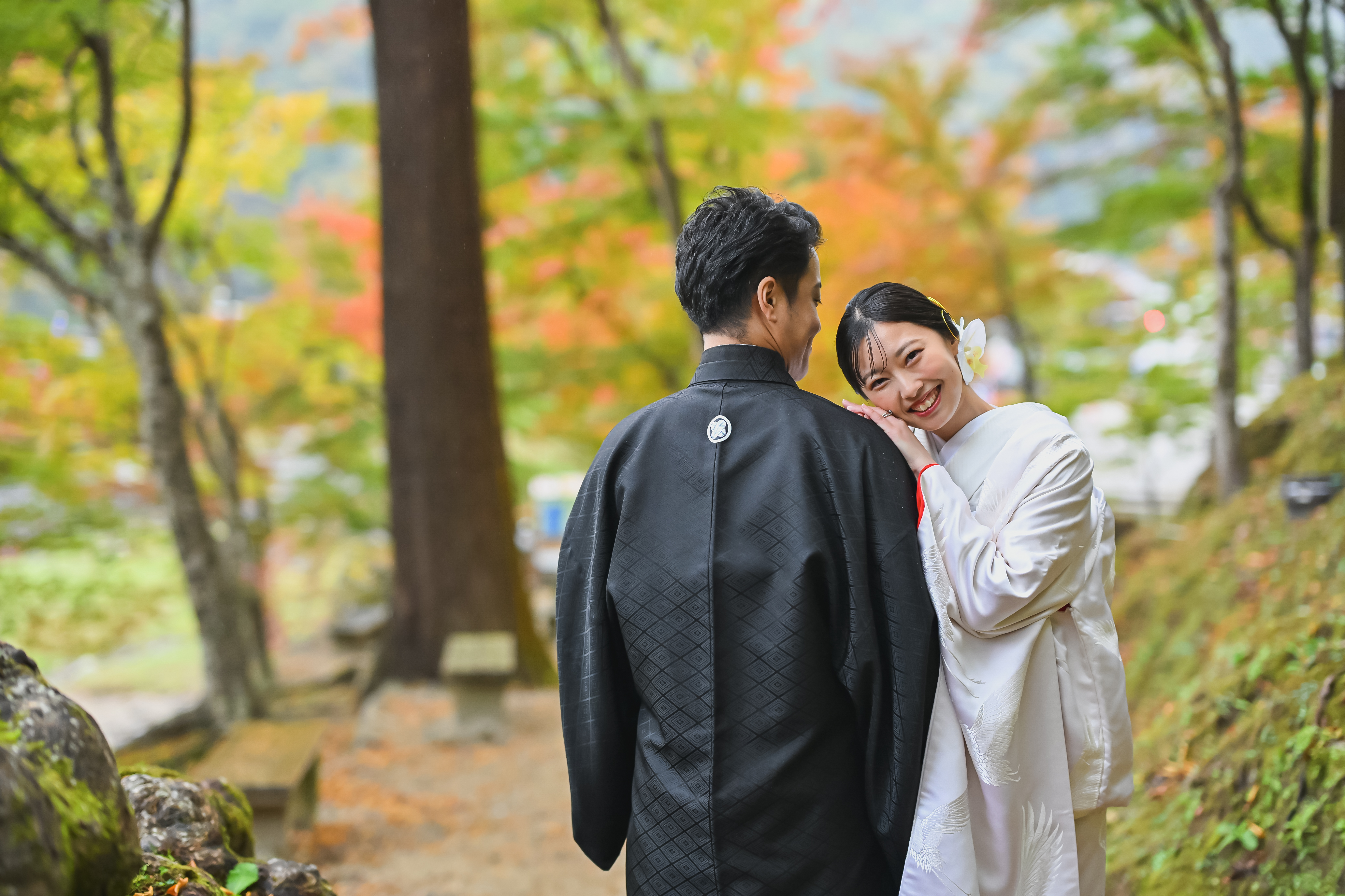 もみじの赤やオレンジに囲まれて、白無垢と綿帽子姿の花嫁さまが立つ光景は、秋ならではの特別な美しさです。白い衣装のやわらかさと紅葉の鮮やかな色合いが重なって、まるで自然の一部のように景色に溶け込んで見えます。