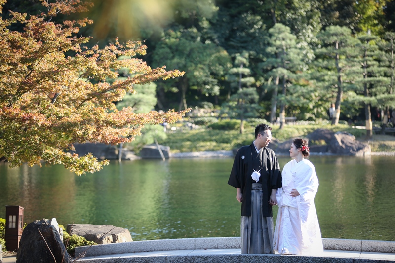 赤・橙・緑に彩られた「徳川園」で前撮り