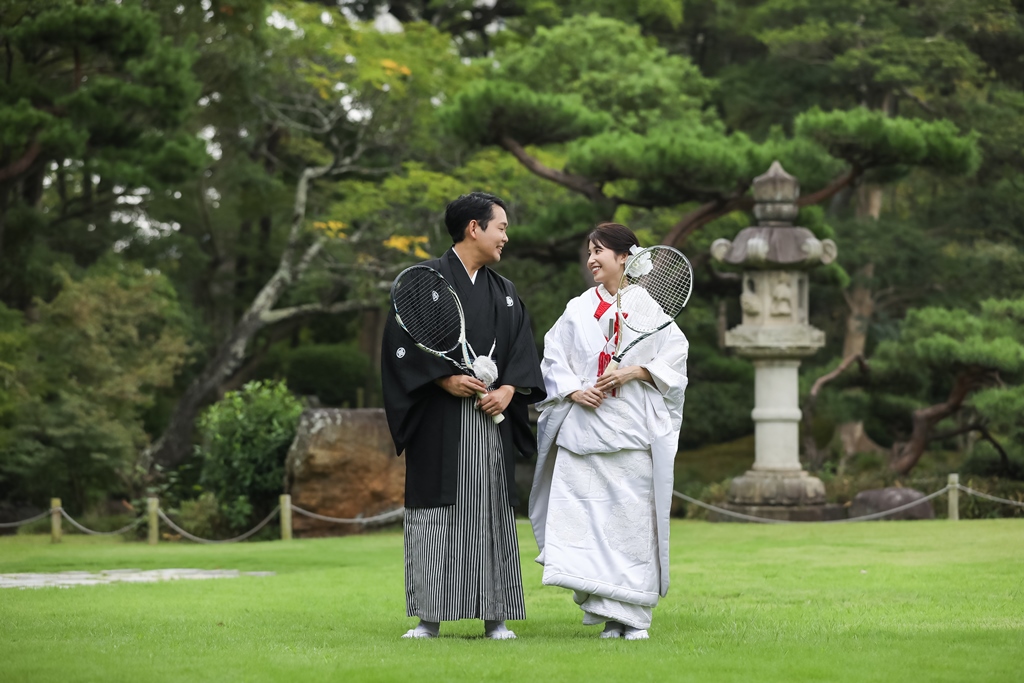 和室はもちろん、洋館でも、庭園でも、色々な場所で撮影を楽しめて、六華苑を満喫していただけましたね。こだわりアイテムのテニスラケットを持ってのお写真では、とびきりの幸せいっぱいな笑顔がとっても素敵です。