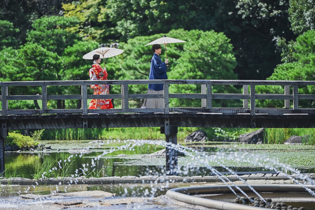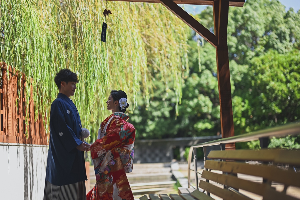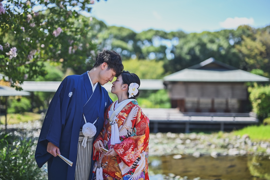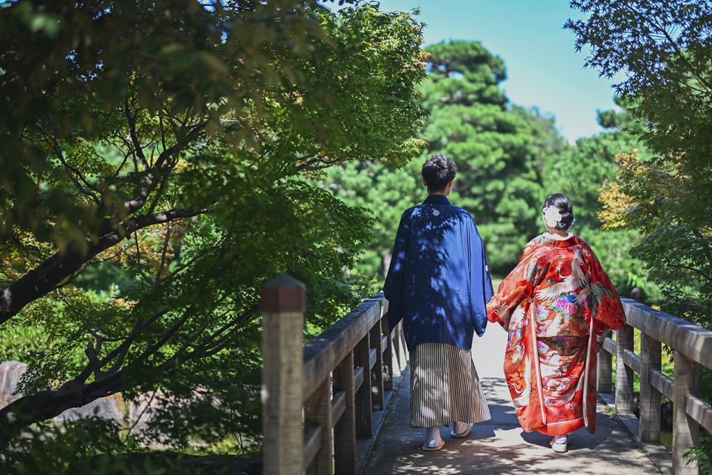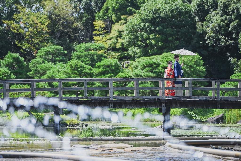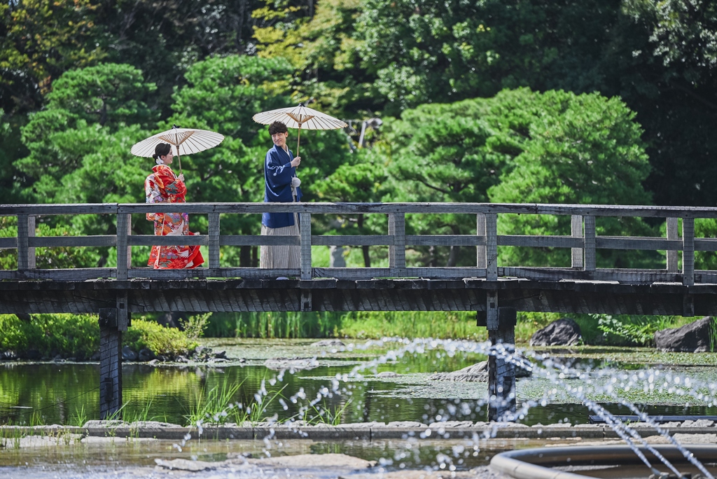 朱色の橋を渡る姿、松林の間から差し込む光に包まれる瞬間、水面に映るおふたりの笑顔、どの一瞬も絵画のように美しく、カメラを構えるスタッフ全員が息をのむほどでした。おふたりの中にある「日本らしさ」や「伝統を大切にしたい」という想いが、白鳥庭園の空間と見事に重なり、そこから生まれた一枚一枚には、単なる記録ではなく“心の温度”が感じられます。