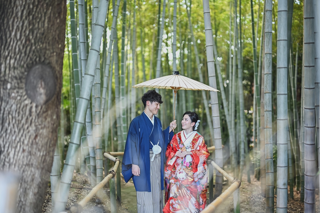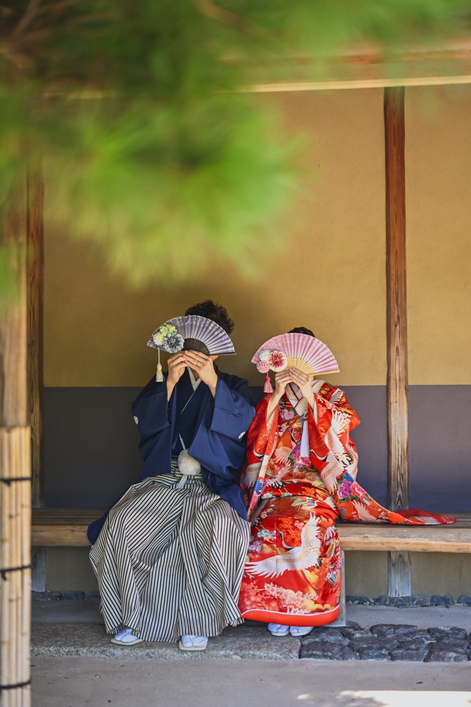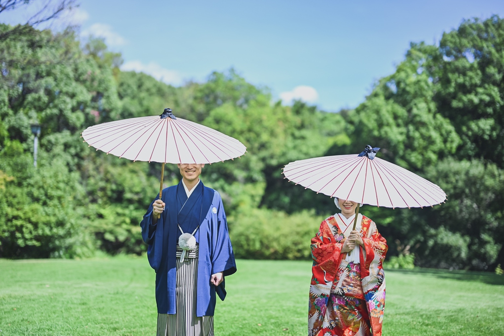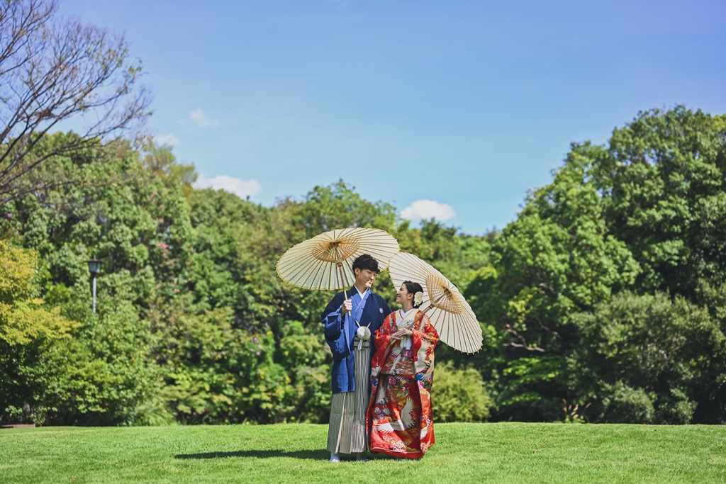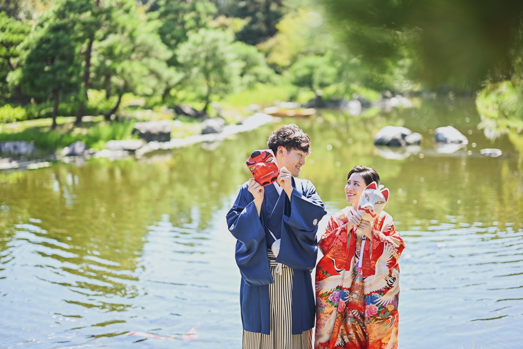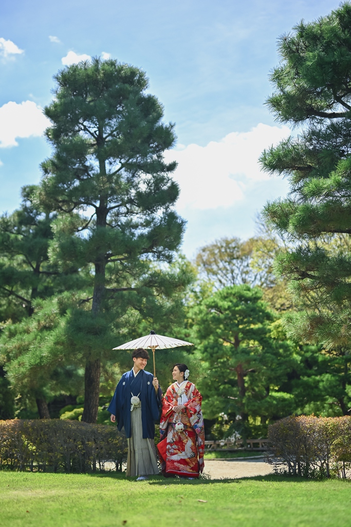 朱色の橋を渡る姿、松林の間から差し込む光に包まれる瞬間、水面に映るおふたりの笑顔、どの一瞬も絵画のように美しく、カメラを構えるスタッフ全員が息をのむほどでした。おふたりの中にある「日本らしさ」や「伝統を大切にしたい」という想いが、白鳥庭園の空間と見事に重なり、そこから生まれた一枚一枚には、単なる記録ではなく“心の温度”が感じられます。