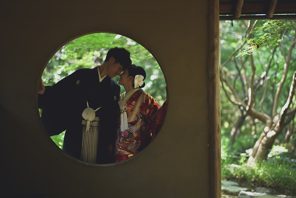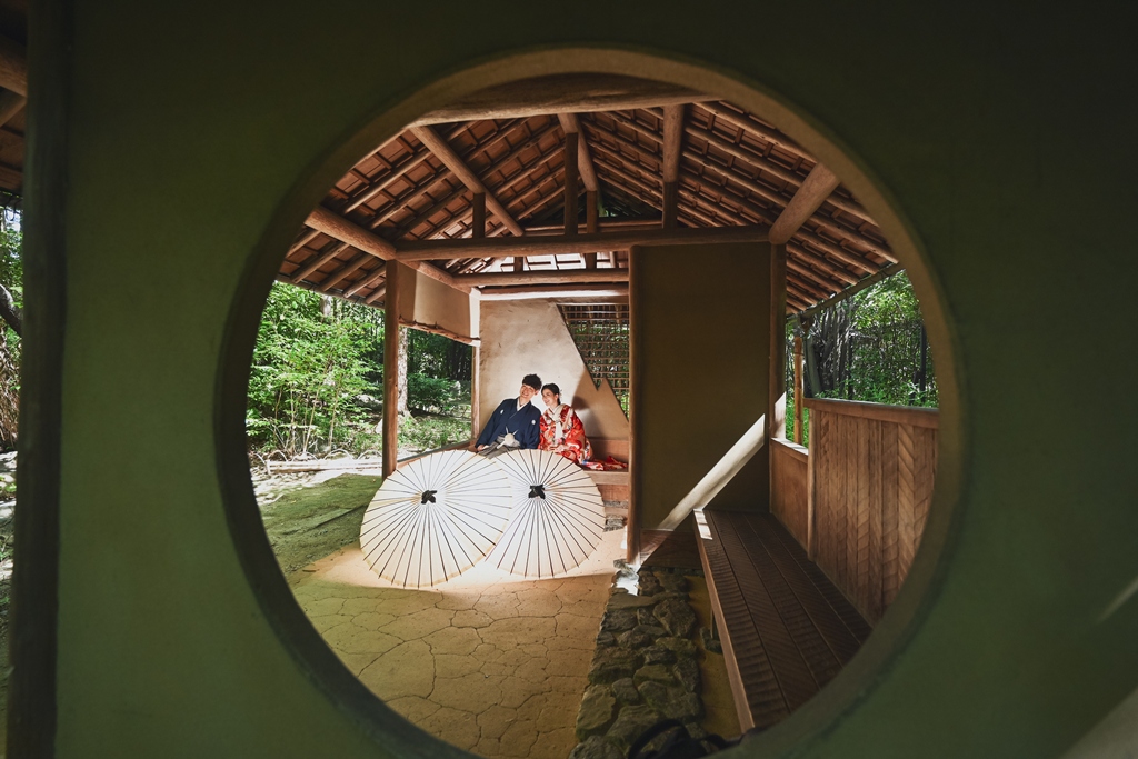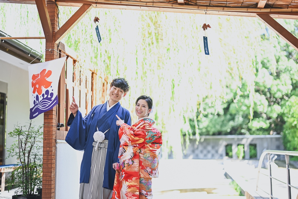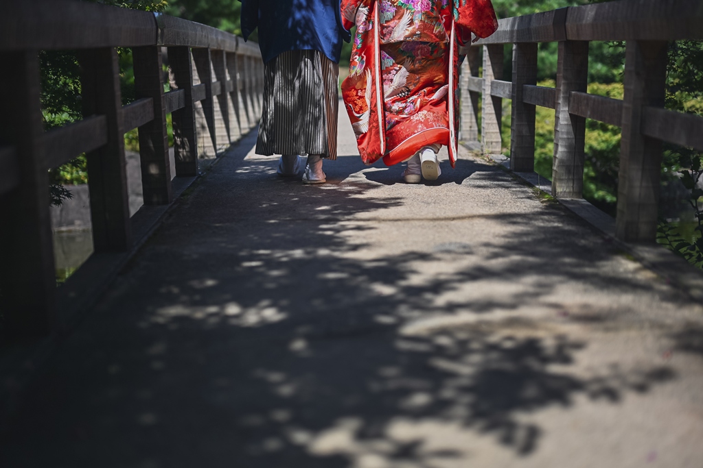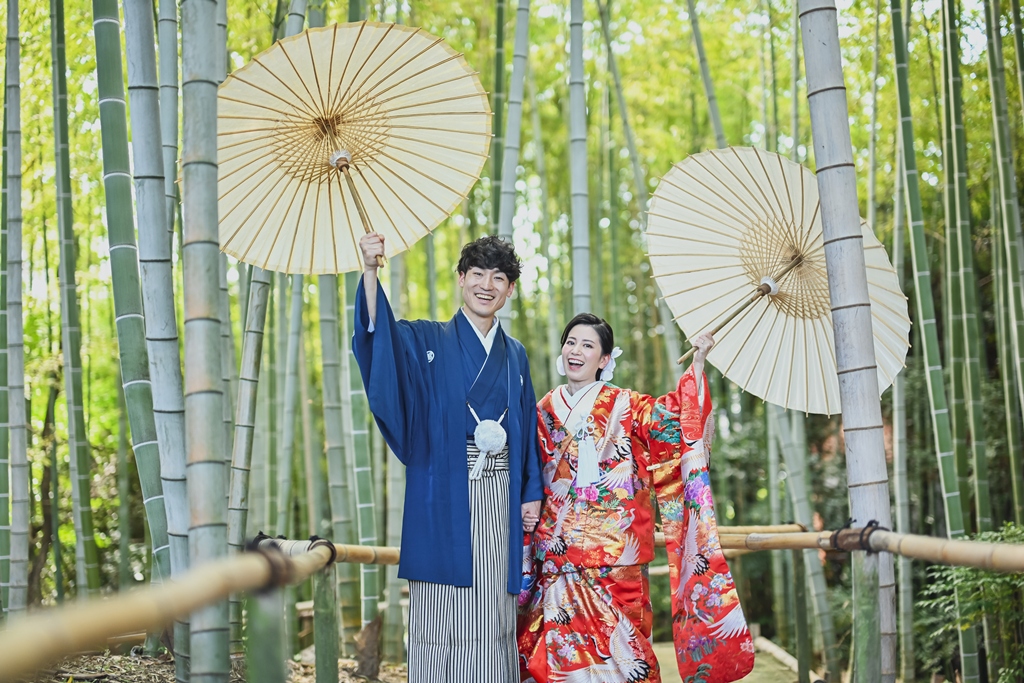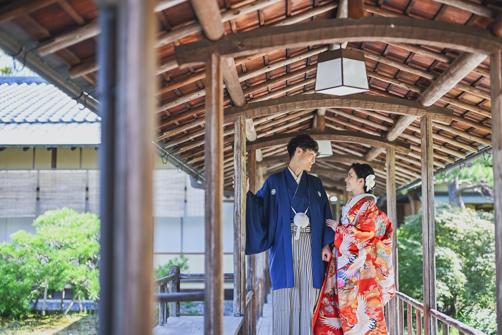 朱色の橋を渡る姿、松林の間から差し込む光に包まれる瞬間、水面に映るおふたりの笑顔、どの一瞬も絵画のように美しく、カメラを構えるスタッフ全員が息をのむほどでした。おふたりの中にある「日本らしさ」や「伝統を大切にしたい」という想いが、白鳥庭園の空間と見事に重なり、そこから生まれた一枚一枚には、単なる記録ではなく“心の温度”が感じられます。