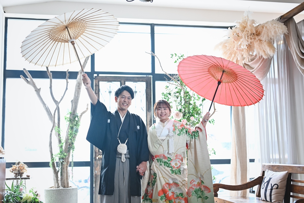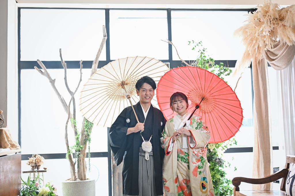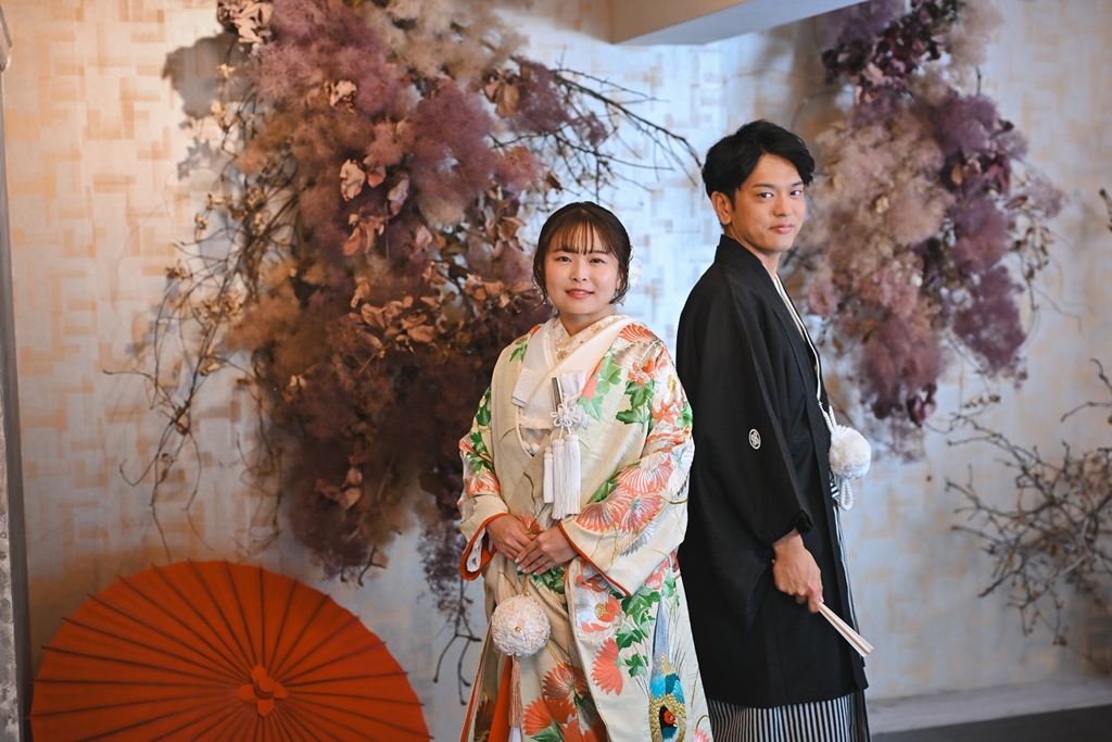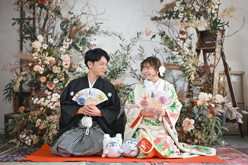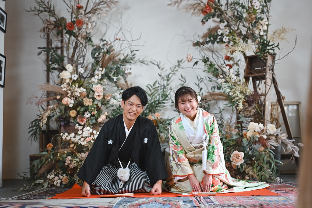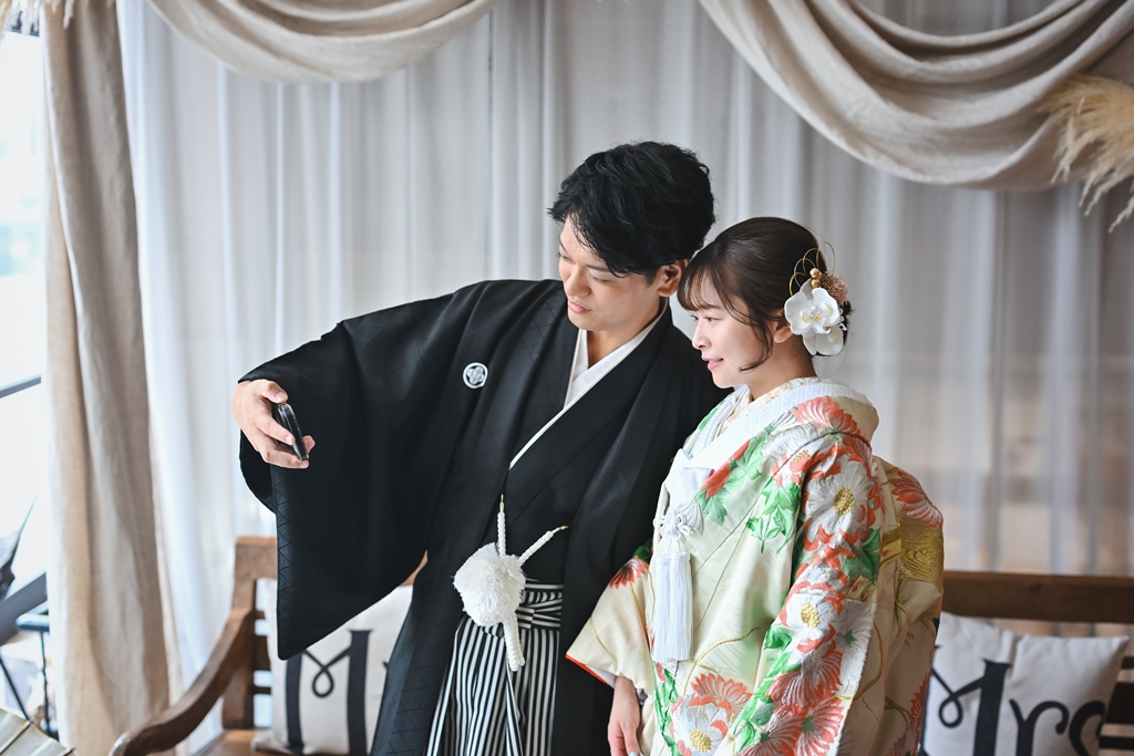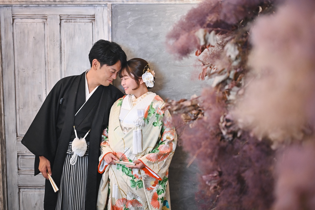 光と陰影が織りなすスタジオの空気感が、おふたり本来の柔らかさと幸せな雰囲気をいっそう引き立て、心温まるシーンが次々と生まれておりました。和装での凛とした美しさ、洋装での明るく華やかな表情。