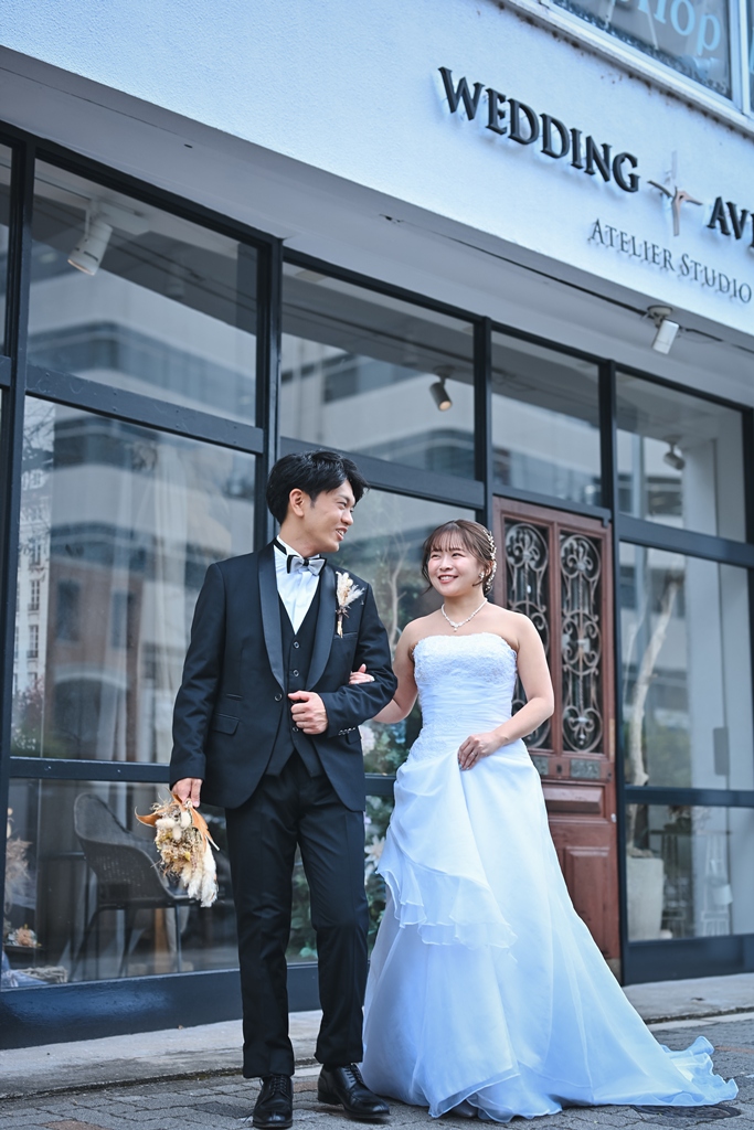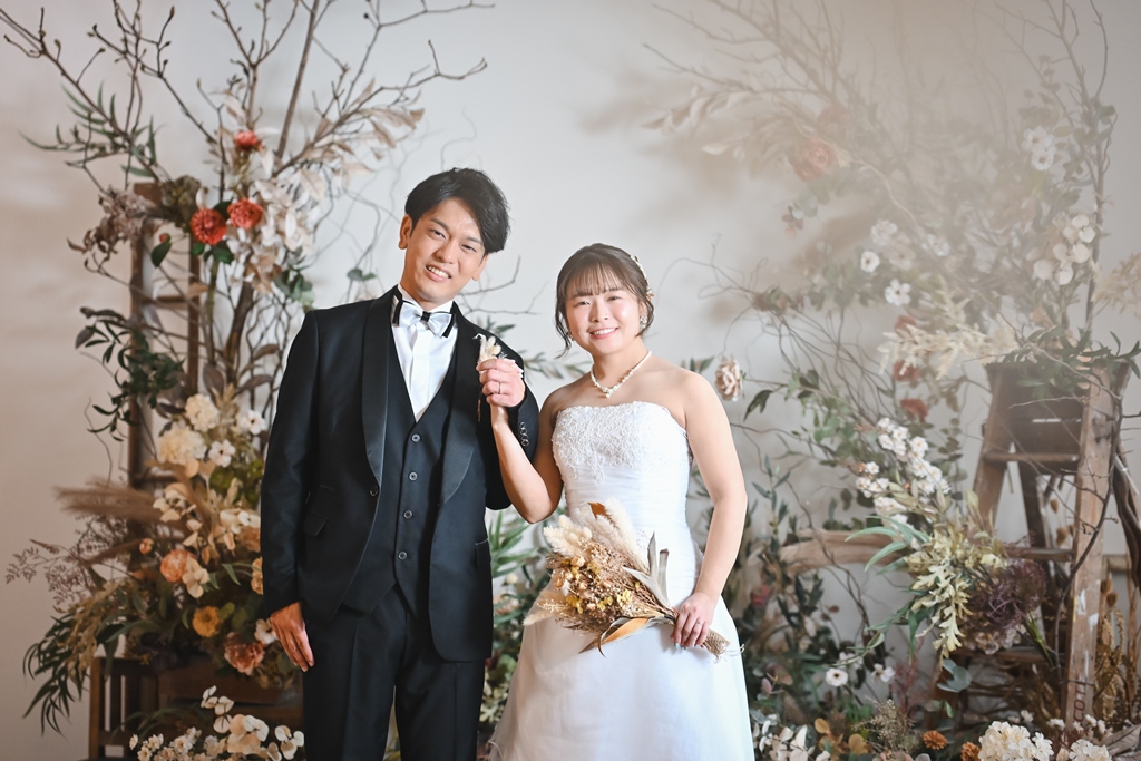 おふたりがそっと視線を合わせたり、手を重ねられたりする度に、穏やかな空気がスタジオに広がり、品のある優しい時間が流れておりました。続く洋装での撮影では、ドレスとタキシードに身を包んだおふたりが、自然な笑顔で過ごされている姿がとても印象的でした。