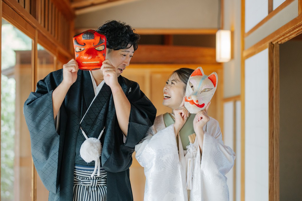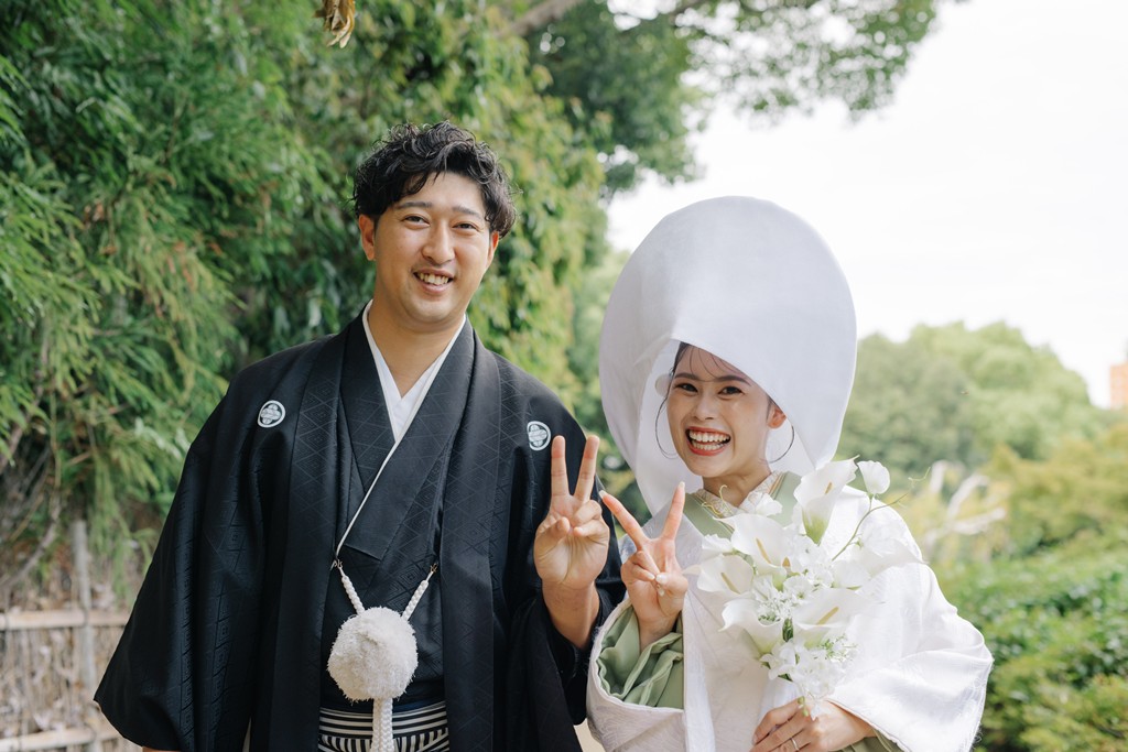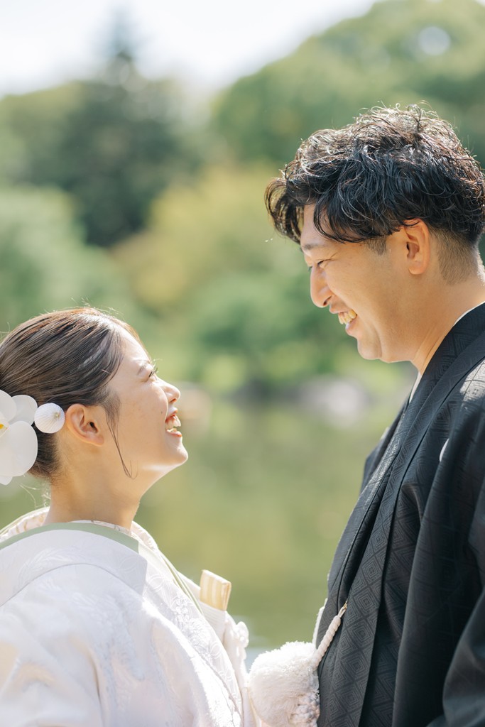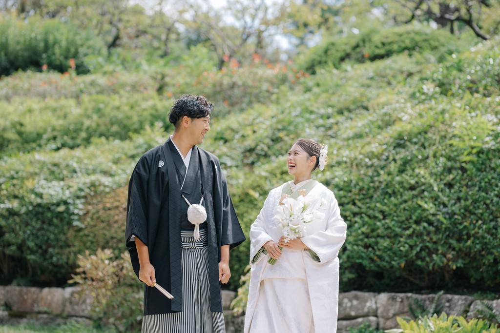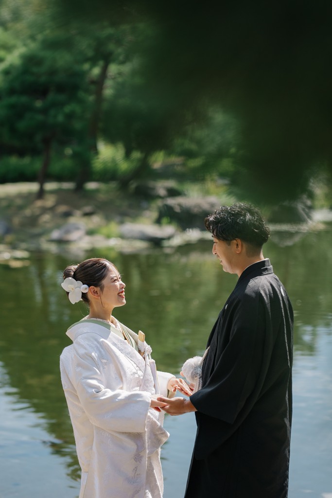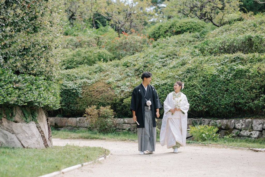 歩くたび、振り向くたびに表情が変わる和装の美しさが、この庭園でより一層輝いていました。そして何より、おふたりが自然体で見せてくださる笑顔、ふとした瞬間の寄り添う仕草、