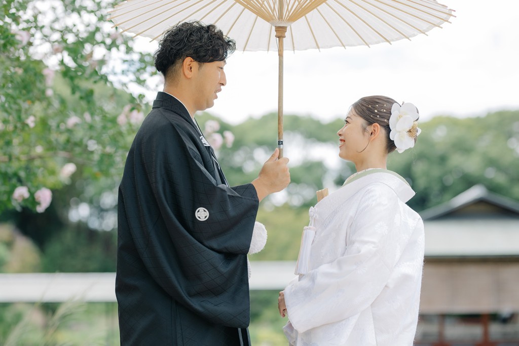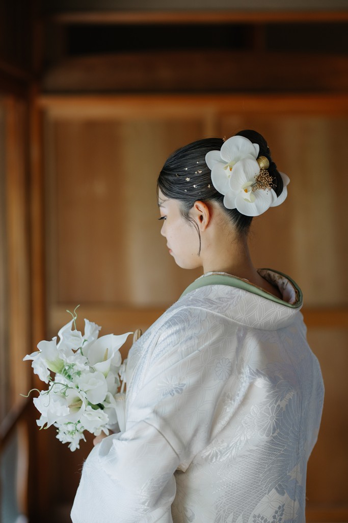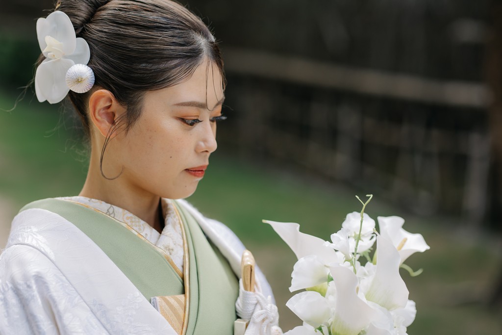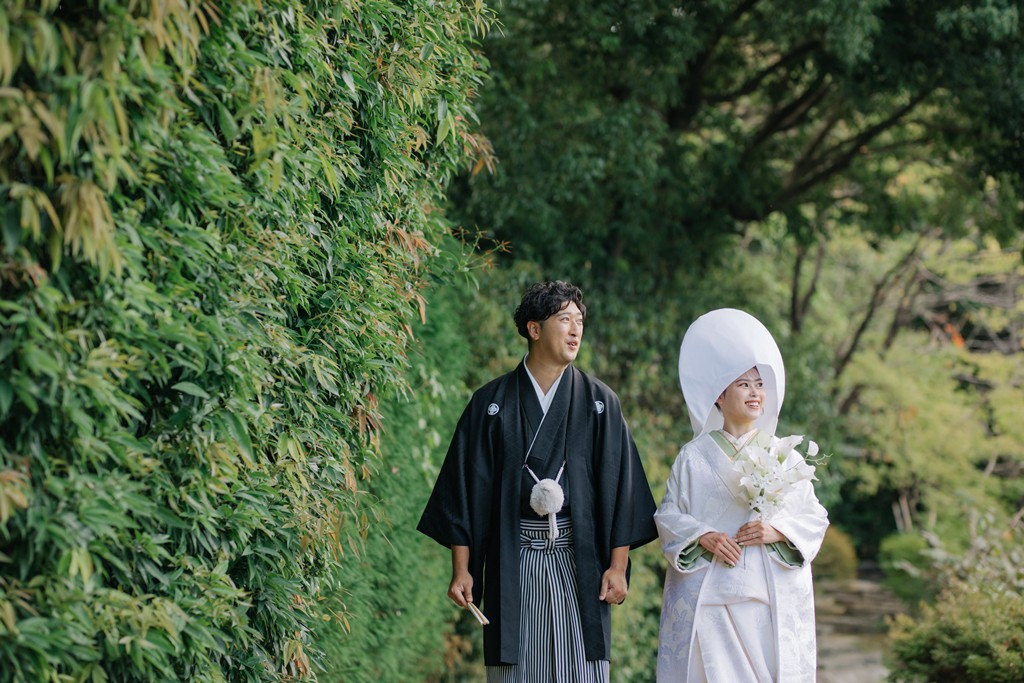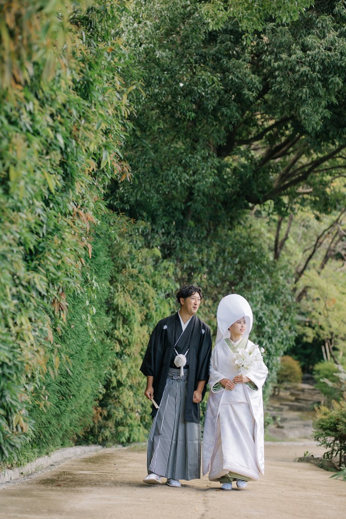 澄んだ水面に映る光、季節の花々、庭石の重厚さ、そのすべてが、おふたりの特別な一日を華やかに引き立ててくれました。撮影当日、和装ならではの品格と凛とした佇まいを纏ったおふたりが、ゆっくりと庭園を歩くたびに、まるで映画のワンシーンのように景色がドラマティックに変化していくのを、スタッフ一同、胸が熱くなる思いで見守っておりました。