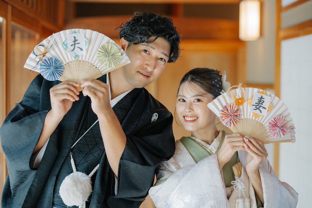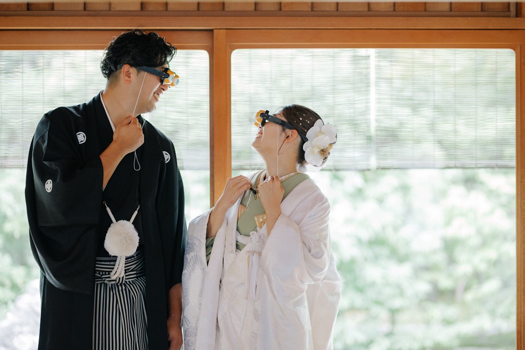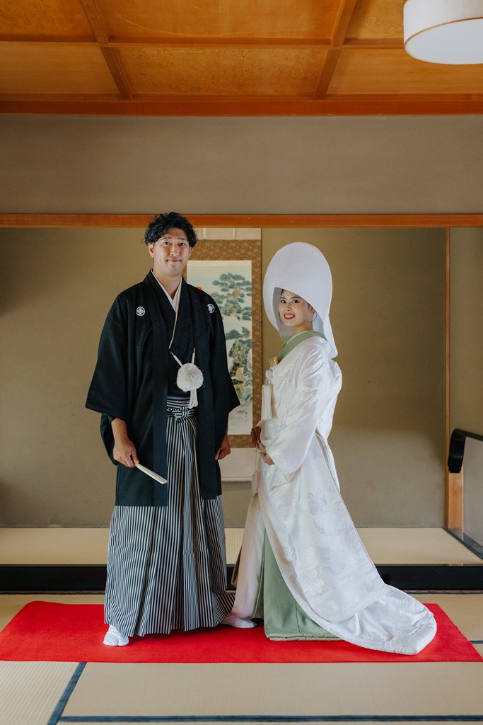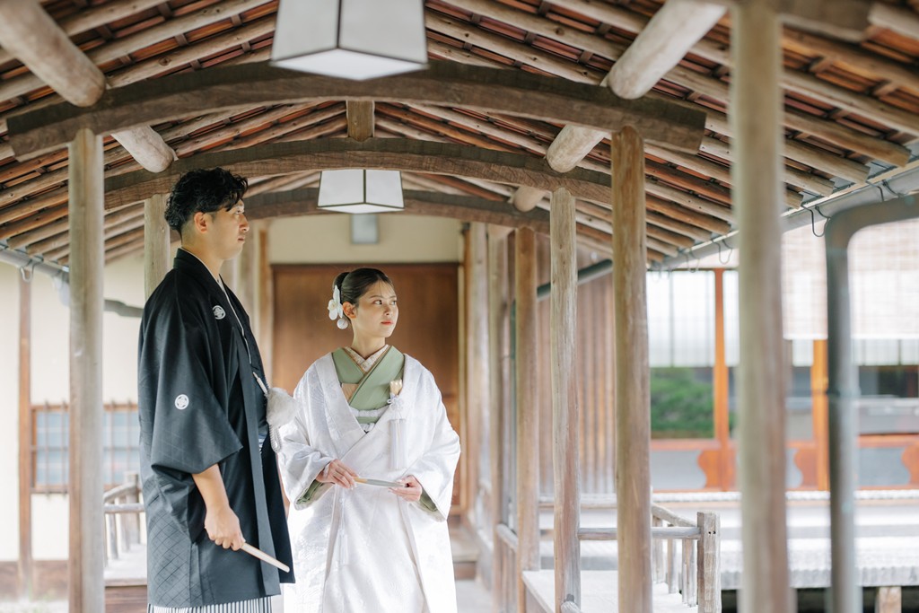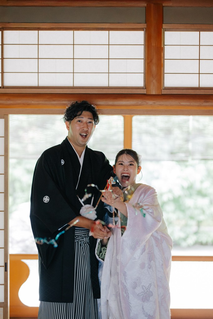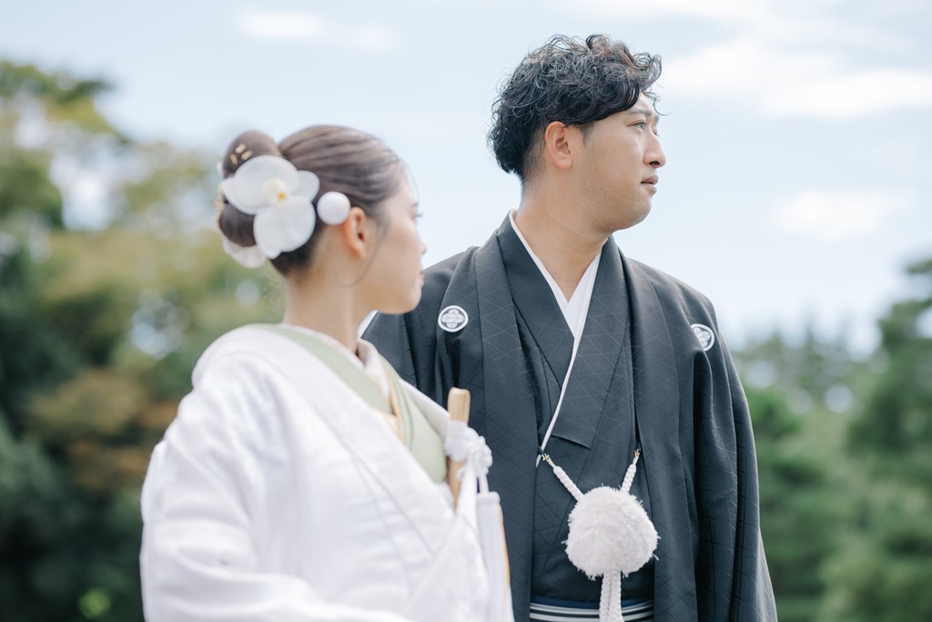 澄んだ水面に映る光、季節の花々、庭石の重厚さ、そのすべてが、おふたりの特別な一日を華やかに引き立ててくれました。撮影当日、和装ならではの品格と凛とした佇まいを纏ったおふたりが、ゆっくりと庭園を歩くたびに、まるで映画のワンシーンのように景色がドラマティックに変化していくのを、スタッフ一同、胸が熱くなる思いで見守っておりました。
