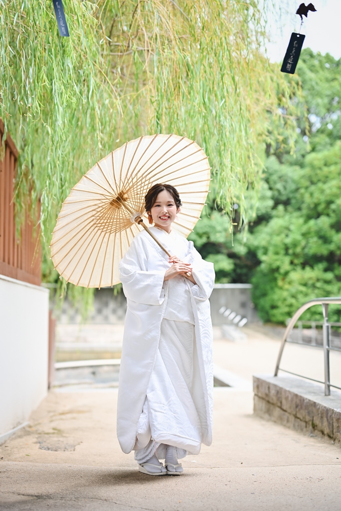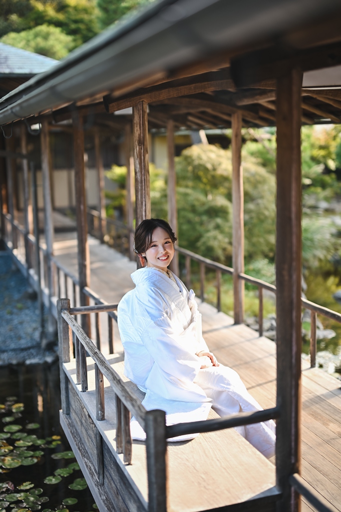 池に映る光が白無垢に優しく反射し、色打掛の華やかな彩りが緑や季節の花と自然に溶け合い、歩くたびに異なる表情を見せてくださったことが非常に印象的でした。