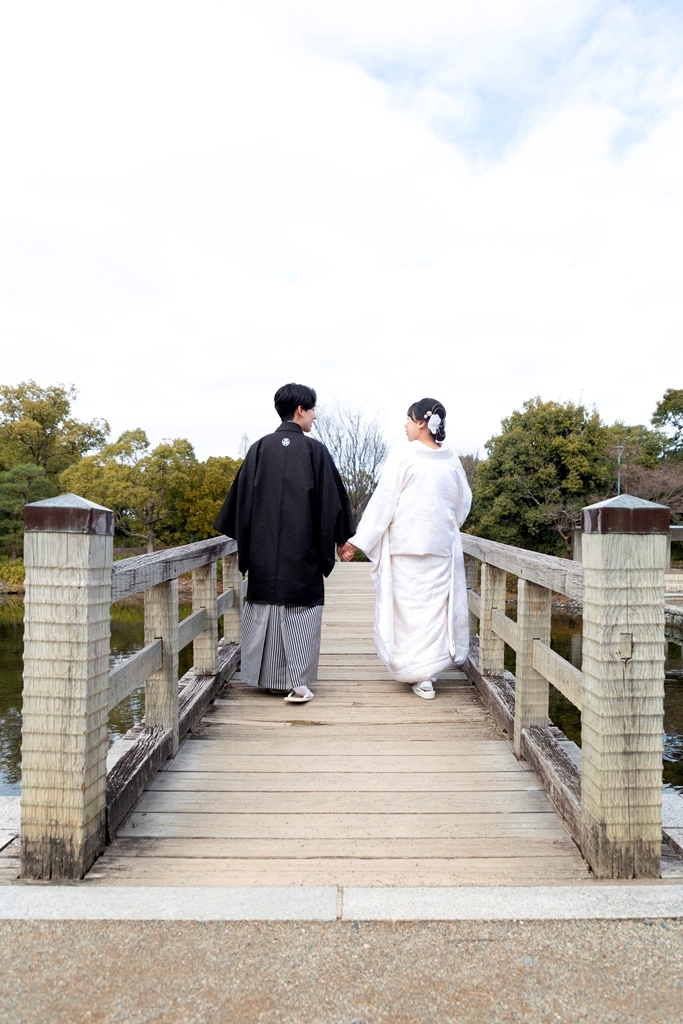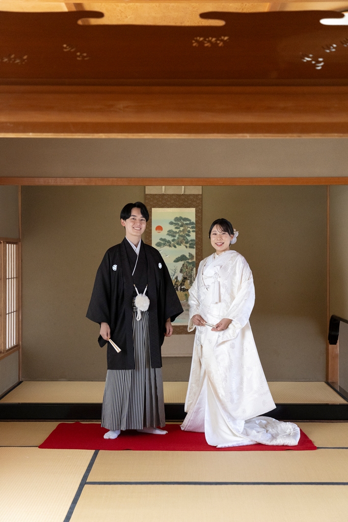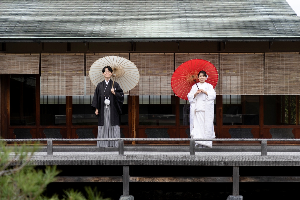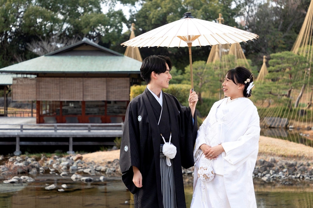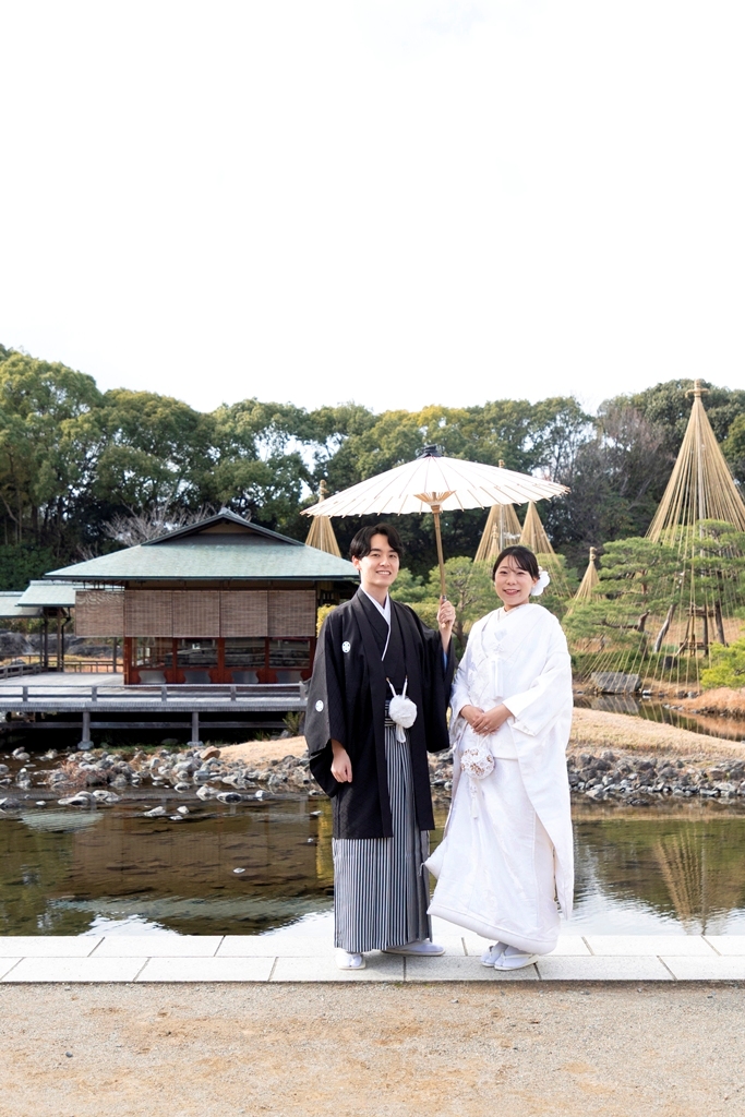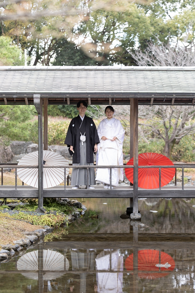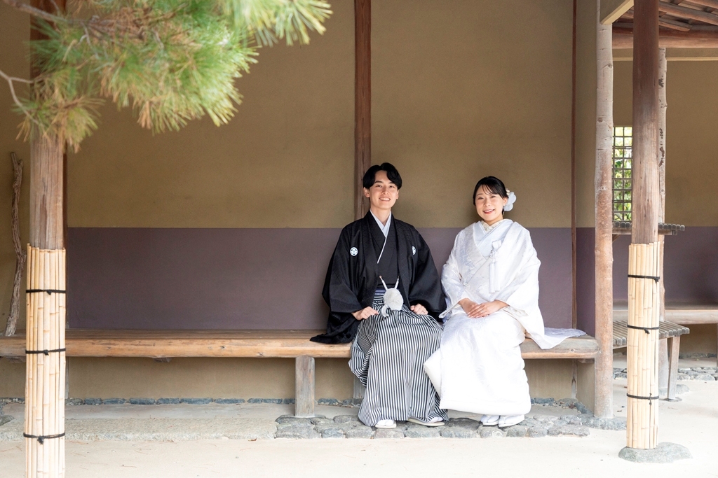 前撮りでは和装を検討していたため、庭園や茶室で撮影したいと考えました。京都か名古屋でのロケーション撮影を希望する中で、インスタグラムの雰囲気が一番良かった白鳥庭園でお願いすることにしました。初めて行きましたが、風情があり、和装にぴったりな場所でした!