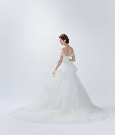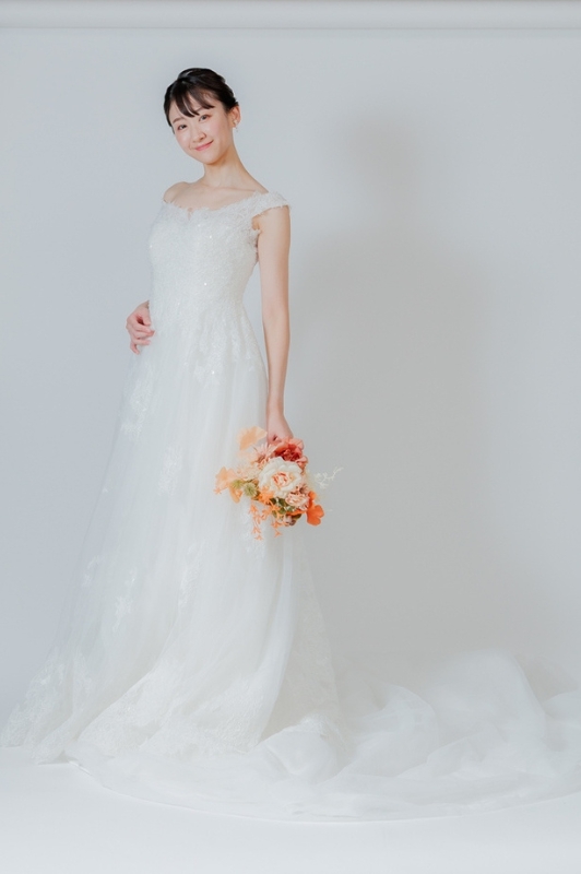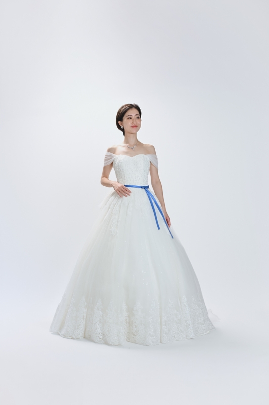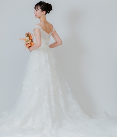特徴:豪華な刺繡が施された高級感のあるサテンのオフショルダードレスでロングトレーンにも細やかな刺繡がされたウェディングに相応しい衣装