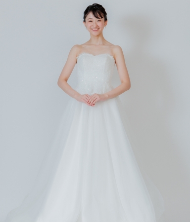 特徴:ビーズやスパンコールの刺繡にオーガンジーのボリュームあるスカートのドレスでリボン付のチュールトレーンは取り外し可能