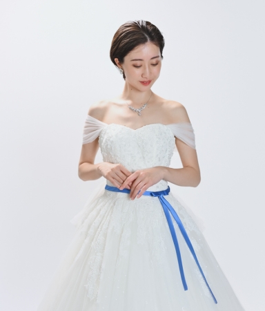 特徴:シンプルなドレスにオフショルダーのレースのボレロとビーズ刺繡のベルトを組み合わせた上品なウェディングドレス