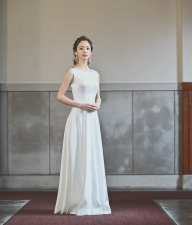 特徴:胸元のドレープとビーズ刺繡のデザインが美しいシンプル系のウェディングドレス